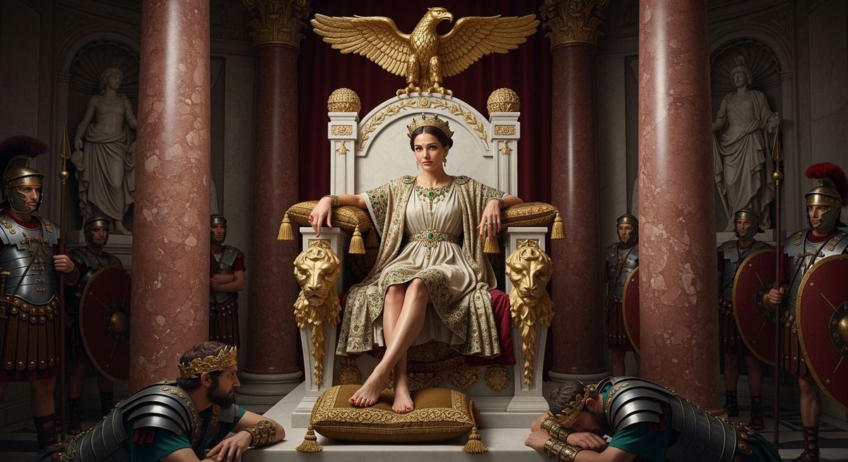 This image shows Empress Messalina on a throne, surrounded by Roman legionnaires. Defeated kings crawl at her feet as she looks down on them with contempt in this photograph using natural lighting.