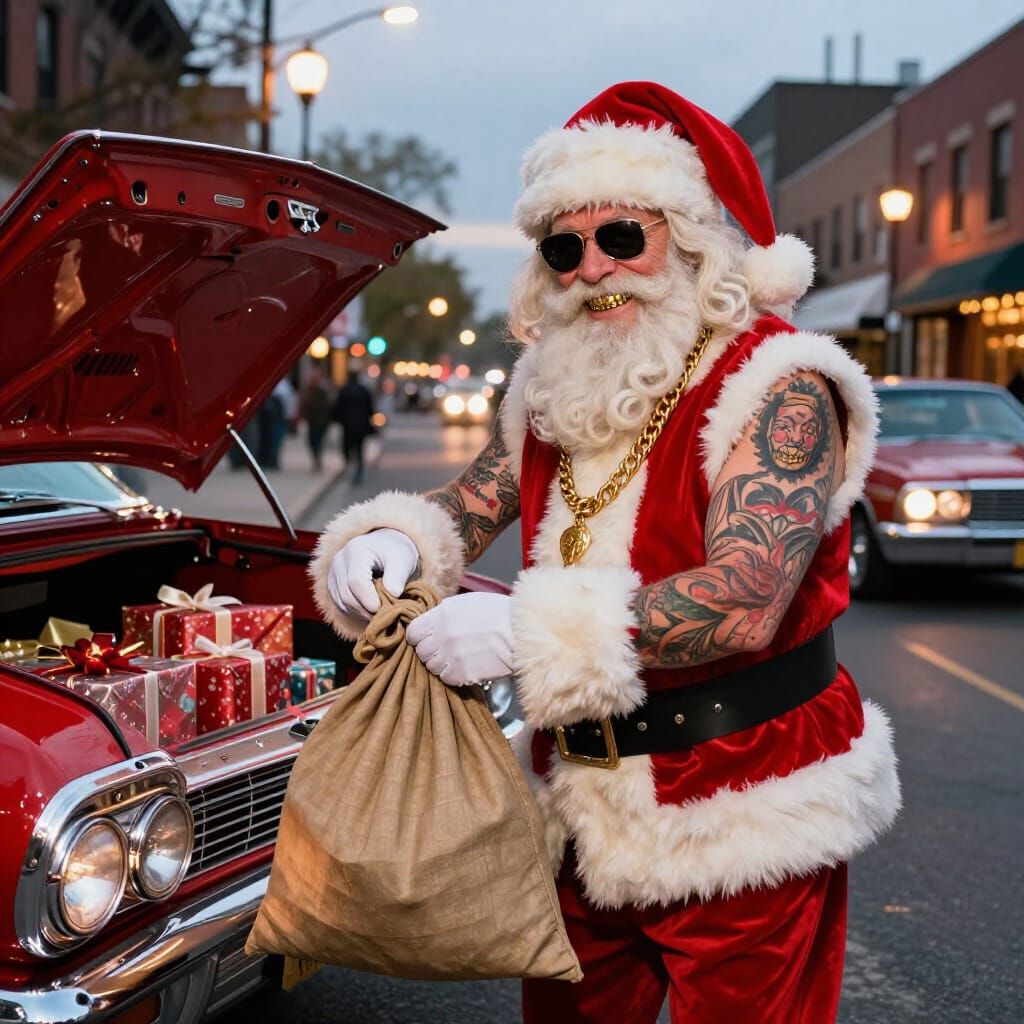 A photorealistic image of a tattooed Santa Claus, resembling Billy Gibbons, in a lowrider car with gifts. The scene is an inner-city neighborhood at dusk, with cinematic lighting.