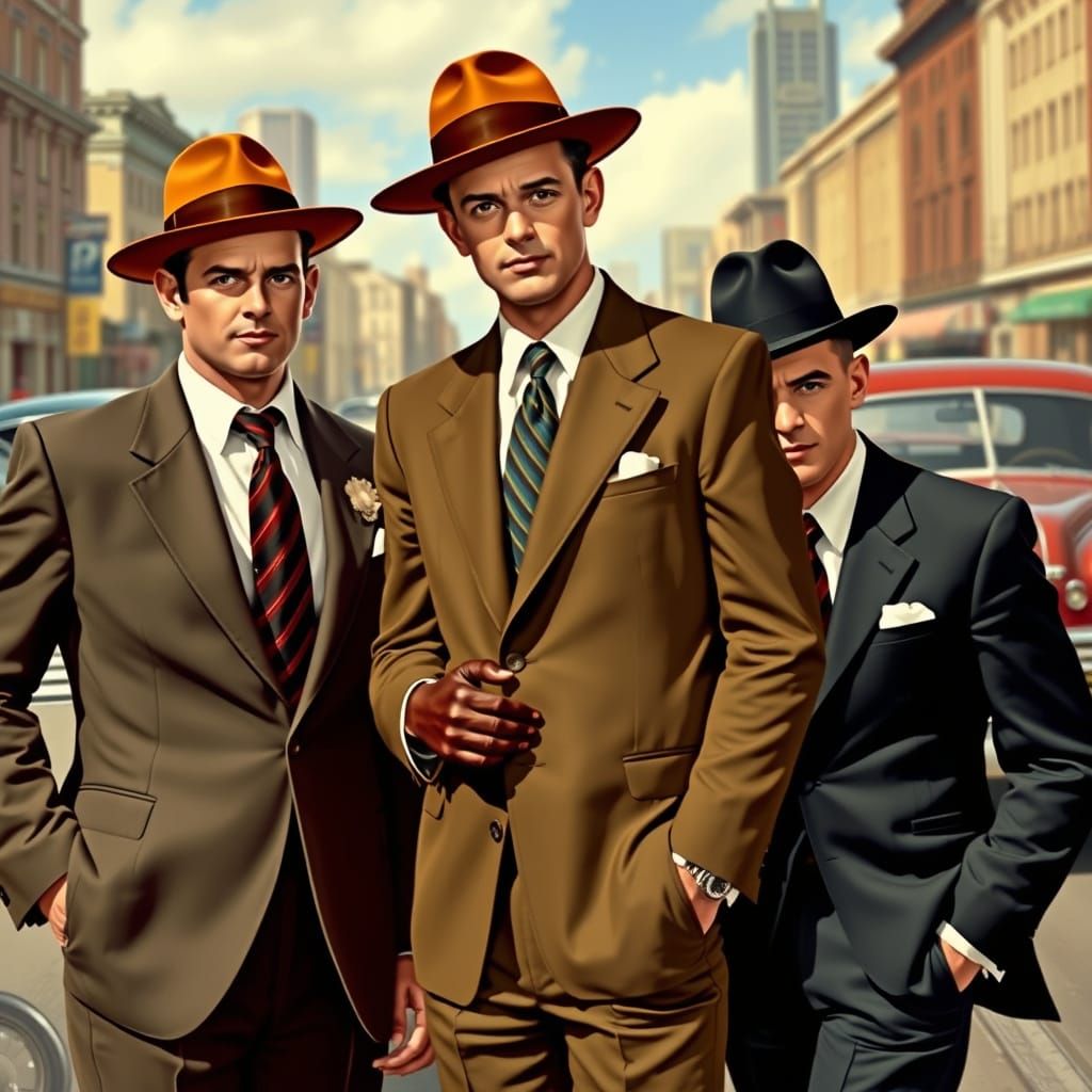 This image portrays men in classic 1950s fashion, complete with fitted suits, fedoras, and leather gloves. The retro scene features vintage cars and city streets in a vibrant, nostalgic style.