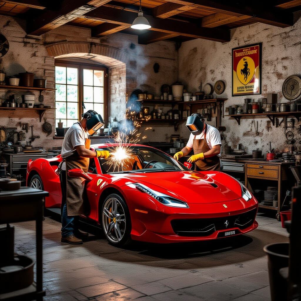 This image shows skilled artisans crafting a red Ferrari sports car in a hidden Tuscan workshop, blending classic automotive photography with Art Deco and Italian Futurism styles. The scene evokes a sense of vintage craftsmanship.