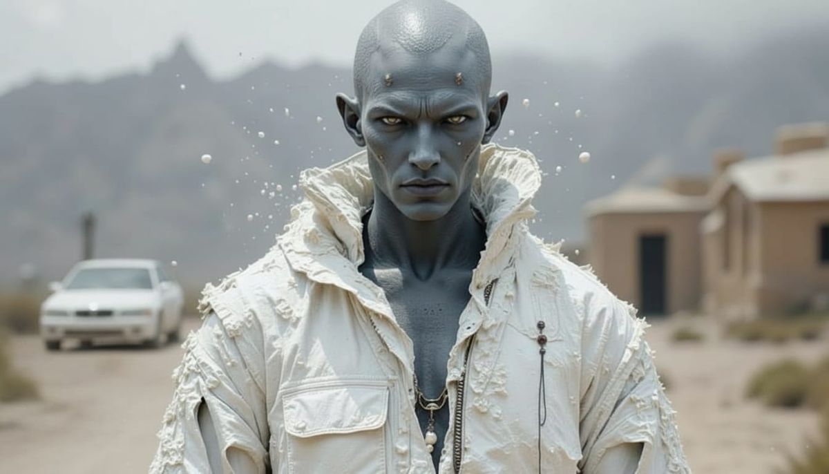 A highly detailed concept art portrait featuring a figure with grey skin in a white jumpsuit, standing beside a white car. Rendered with dynamic lighting and intricate details.