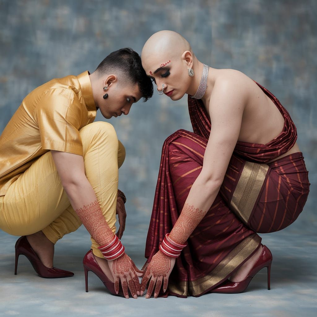 A striking image of a sissy individual in traditional Indian attire, adorned with bold makeup and jewelry, showcasing their submissiveness and humility.