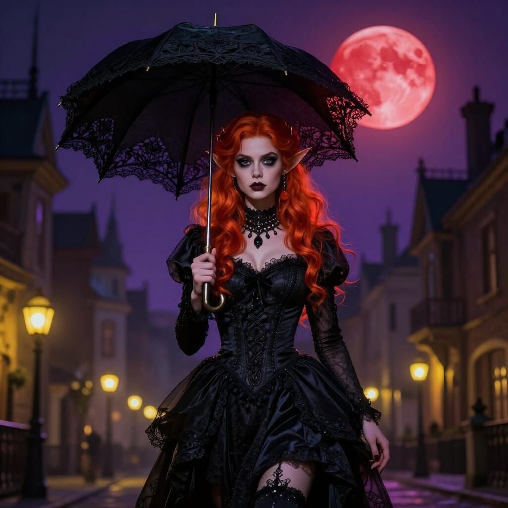 This image shows a regal female elf with red hair and black eyes in a Victorian city at night under a red moon. The art style is dark fantasy concept art with dynamic lighting and rich colors.