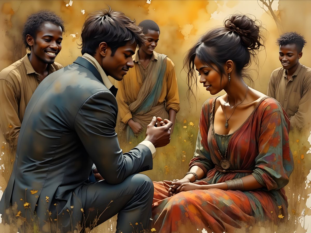 This 3D digital splash art depicts a stock broker proposing to a Romani woman as her disheveled parents look on. The image features textures achieved through plaster and oil, with dramatic lighting.