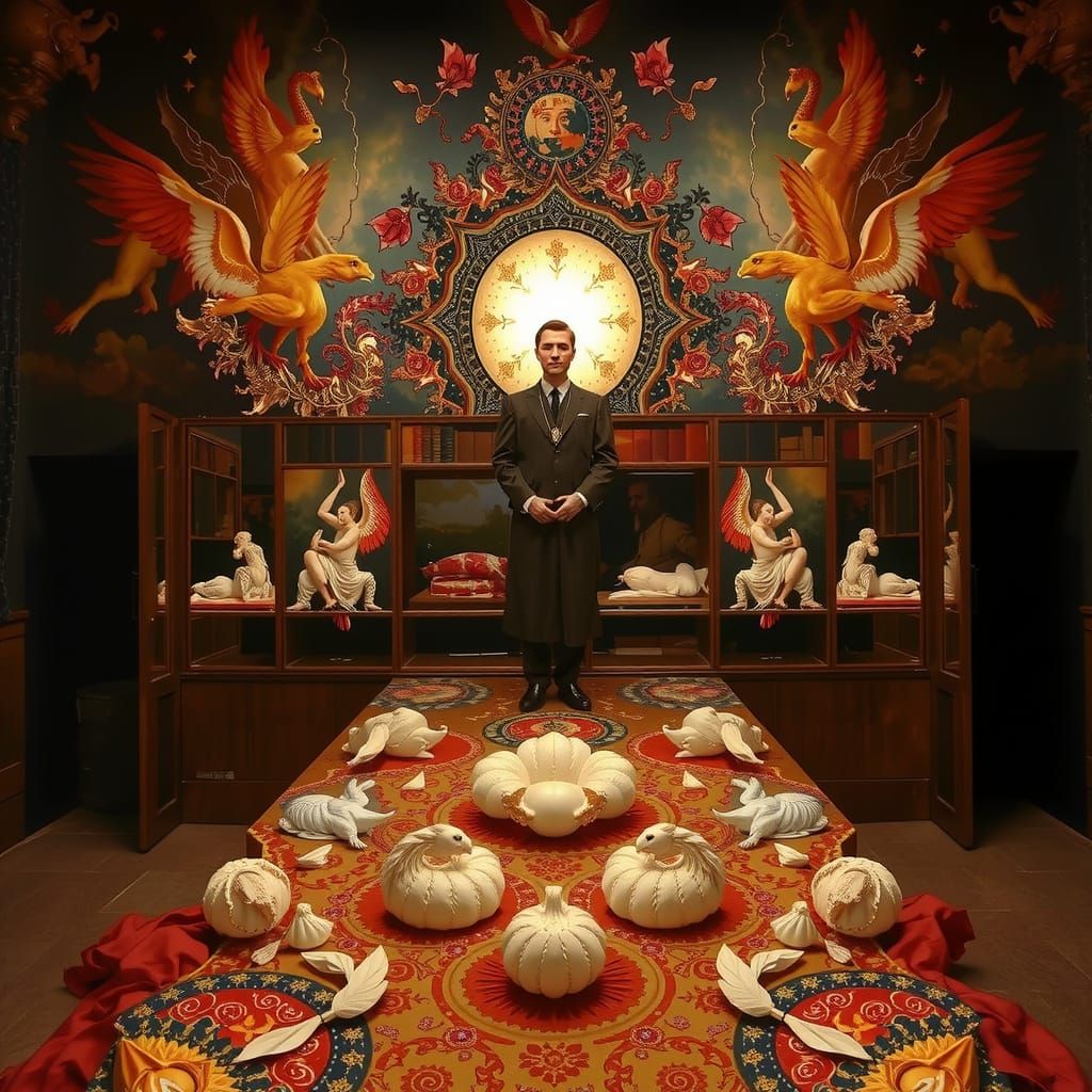 This image shows a magnificent painting embodying beauty and truth. A serene central figure radiates excellence, surrounded by a vibrant, harmonious composition of symbolic elements in brilliant colors and intricate patterns.