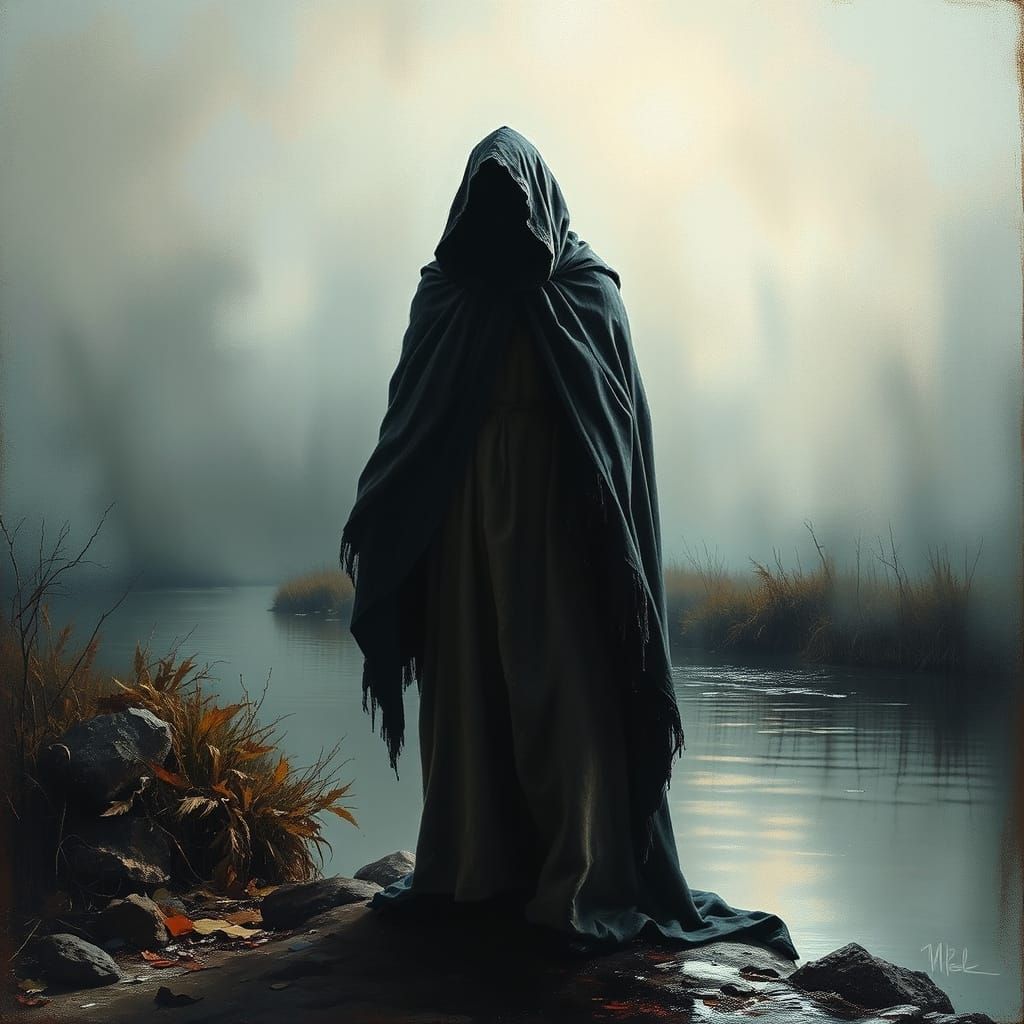 A dramatic painting of a blind seer on a misty riverbank, shrouded in fog. The artwork features expressive textures, baroque flair, dramatic lighting, and vibrant oil colors.