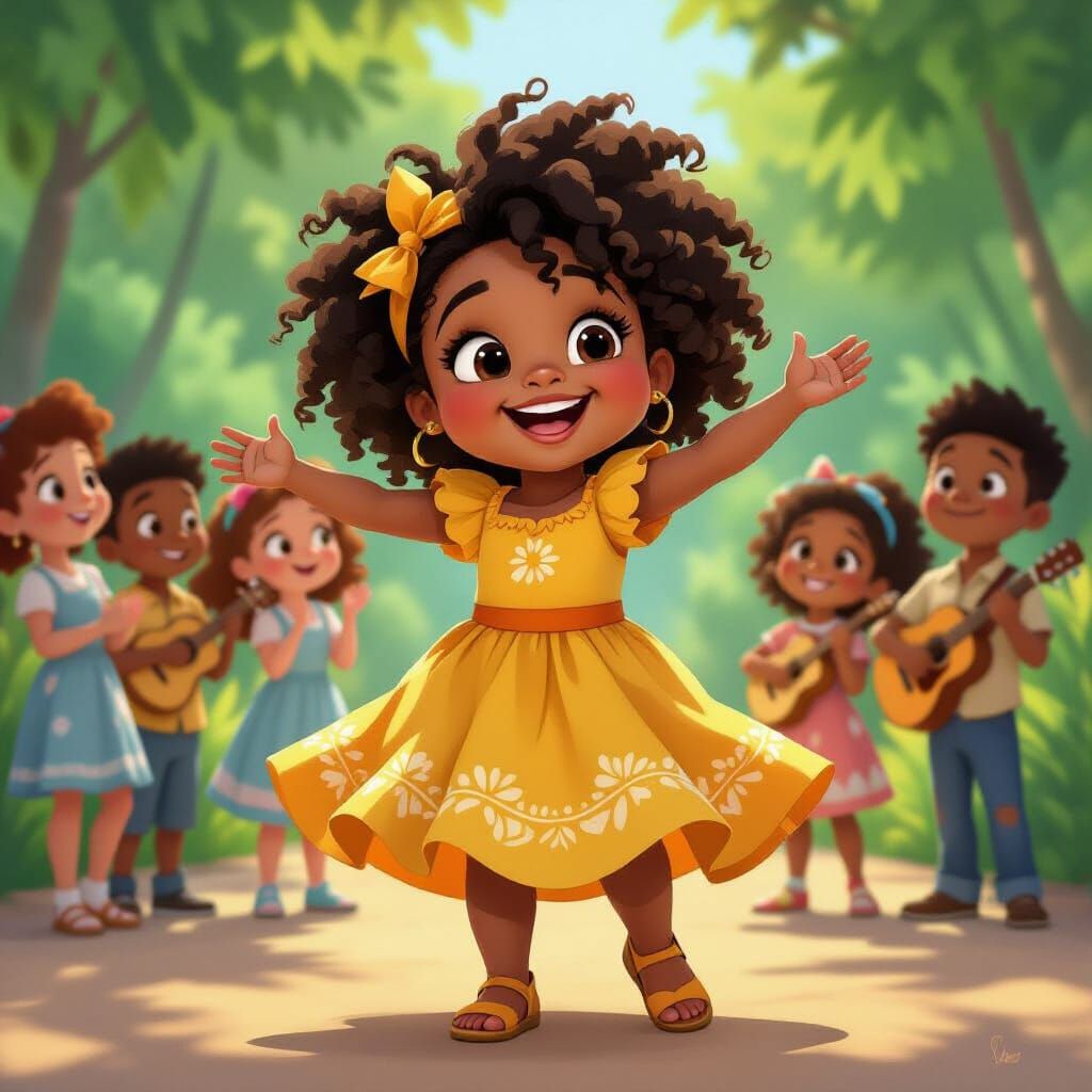 This image features a joyful Black girl in a Caribbean-inspired dress dancing with friends. The scene is animated with warmth and affection, reminiscent of stylized animation.