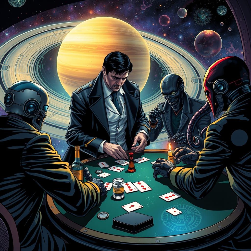 Venetian Polka near Saturn as a bunch of Space pirates gamble on their souls and are trying to push allodial titles onto the Sovereigns of Terra Australis. Once again, the pirates will learn the hard way as God's Angelic team 8 magnetically pushes them to Venus' far, dark moon. Envision an artistic music producer called Matt Pisler as Denzel Washington's character from "The Book of Eli," having descended from the heavens with his Nephilim entourage. The main dark hyena-fallen angel, called Varnis Suryavanshard Songchav, is an Anubis-like hyena hybrid character stuck in the control room of the man-made space star. The S.A.R.C.D. team gambles on the main upper deck, starboard side. Unbeknownst a full reckoning is coming on the portside.