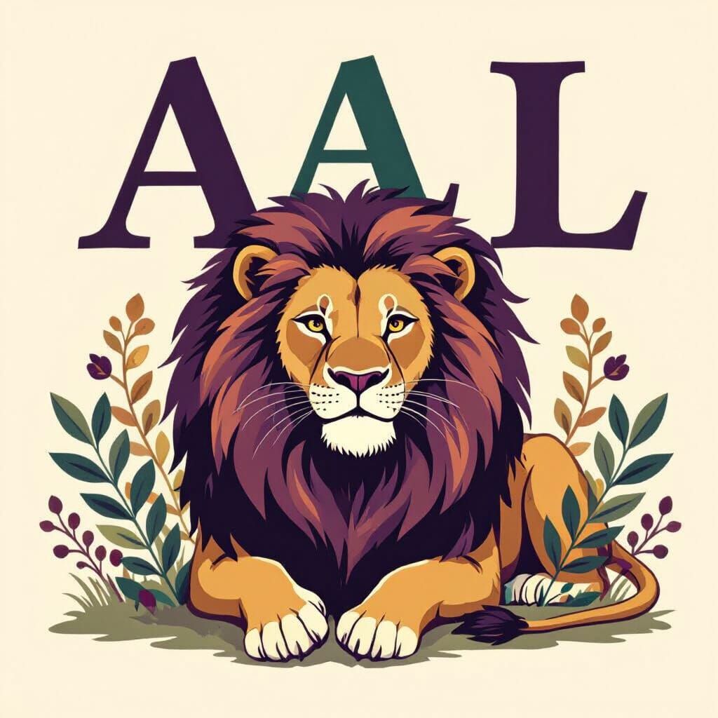 A majestic lion design featuring the letters A and L in purple and dark green on a beige background, inspired by bold, graphic illustration styles.