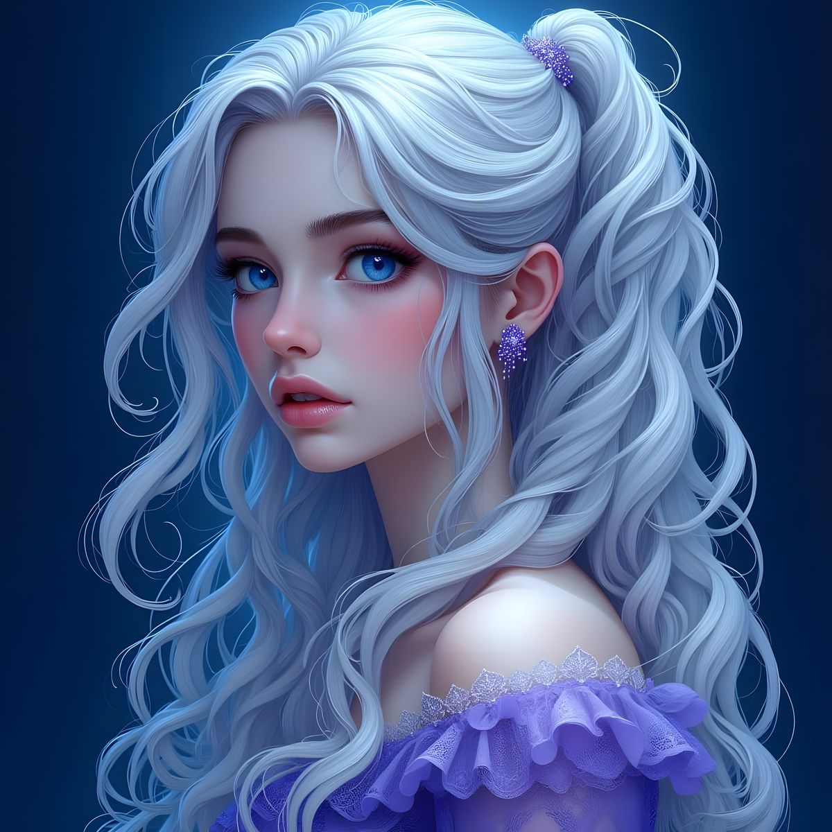 This image shows a beautiful Norse goddess with silver hair and blue eyes, wearing a violet lace dress. The portrait is rendered in a classic vintage art nouveau style with a misty background.
