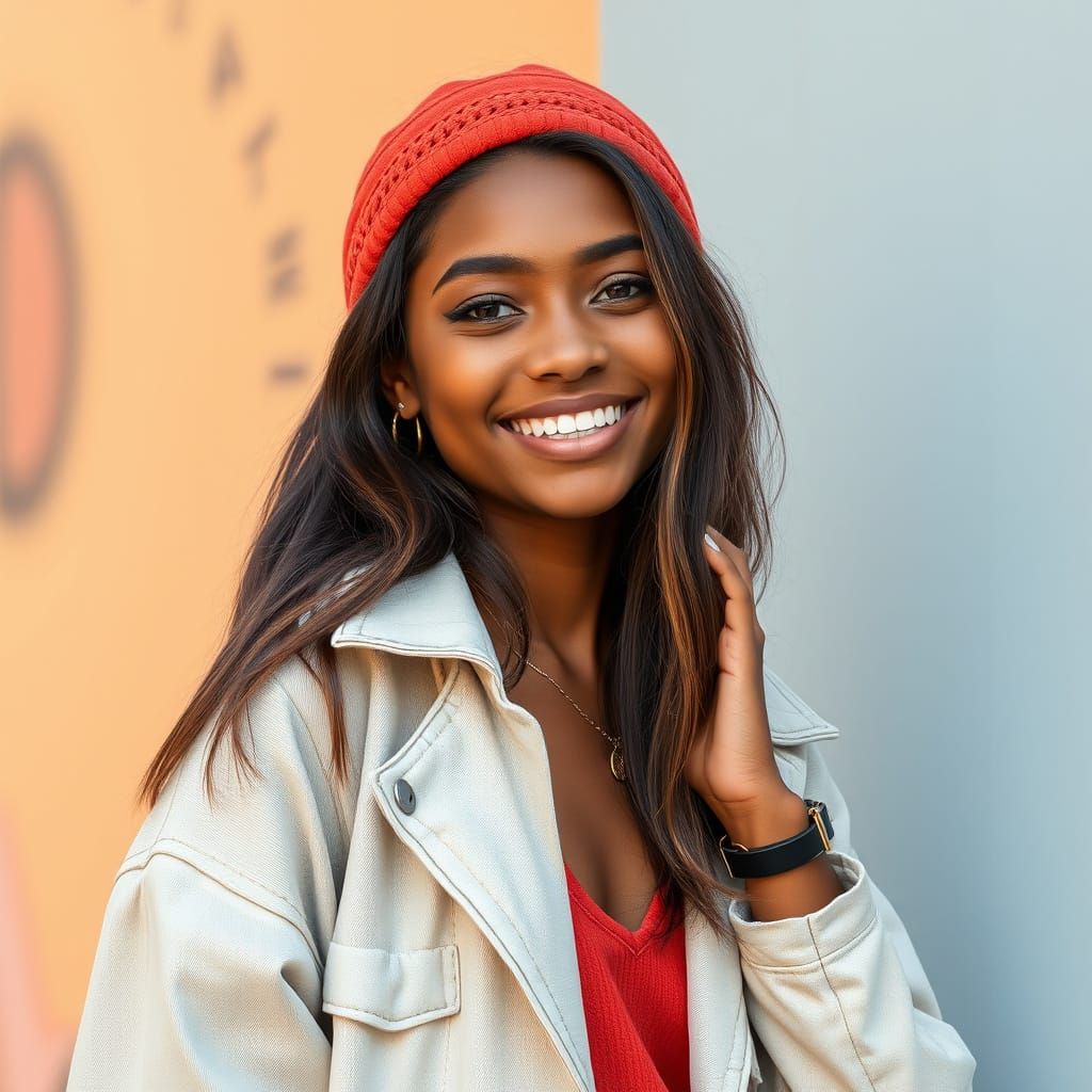 A photorealistic image depicts a smiling, dark-skinned Aeta teenager. She is dressed in modern Gen Z style clothing, conveying a sense of contentment and confidence.