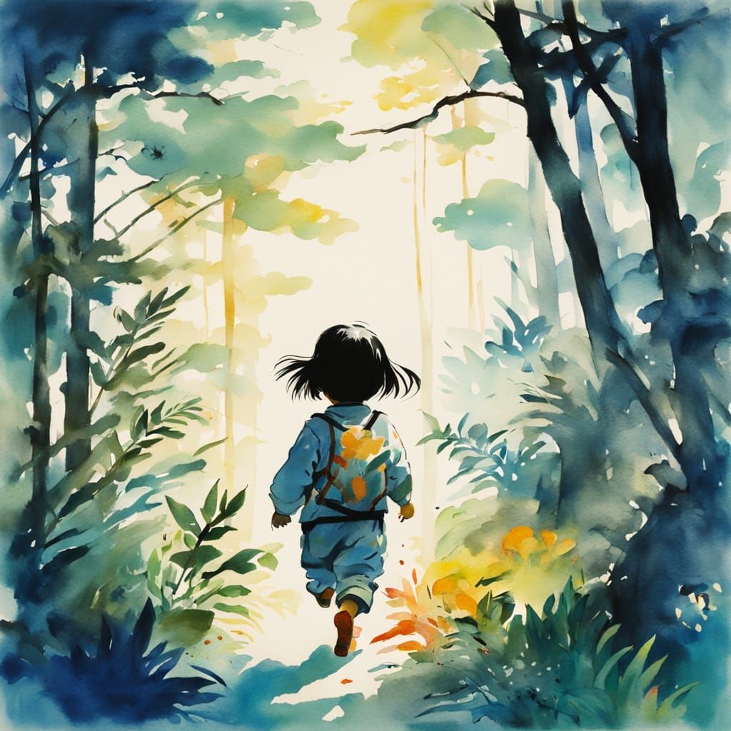 This image depicts a child in a forest, rendered in a Japanese ink painting style with vibrant colors and thick, impressionistic brush strokes. Soft light illuminates glowing tropical plants.