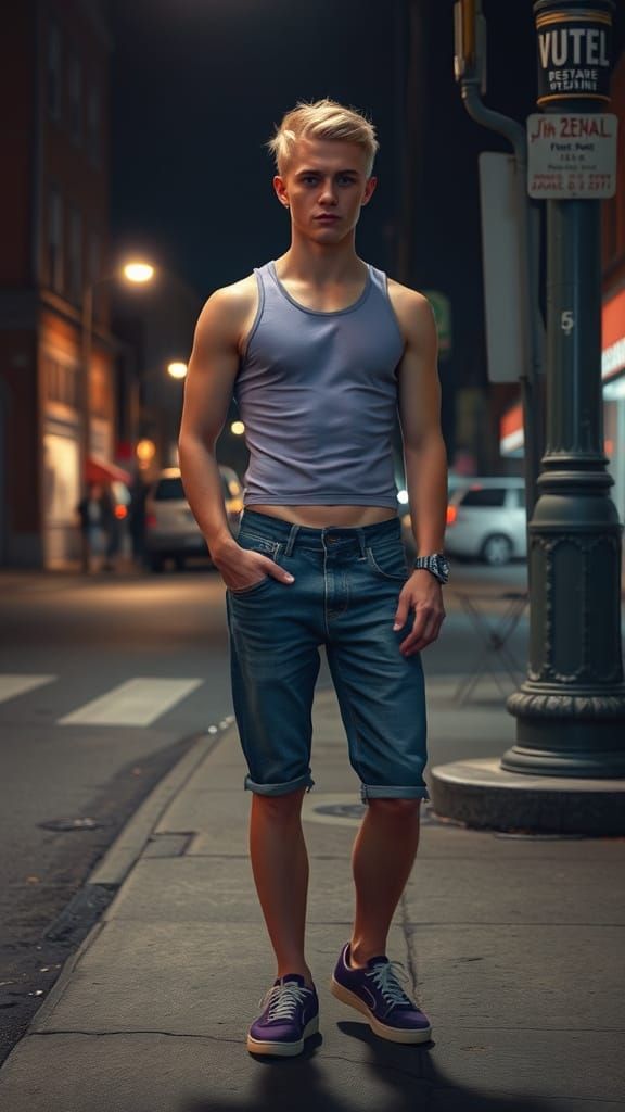 A digital painting of a stylish blonde man in cutoff jeans and a crop top standing on a street corner. This digital artwork features hyperrealistic textures and a moody, cinematic atmosphere.