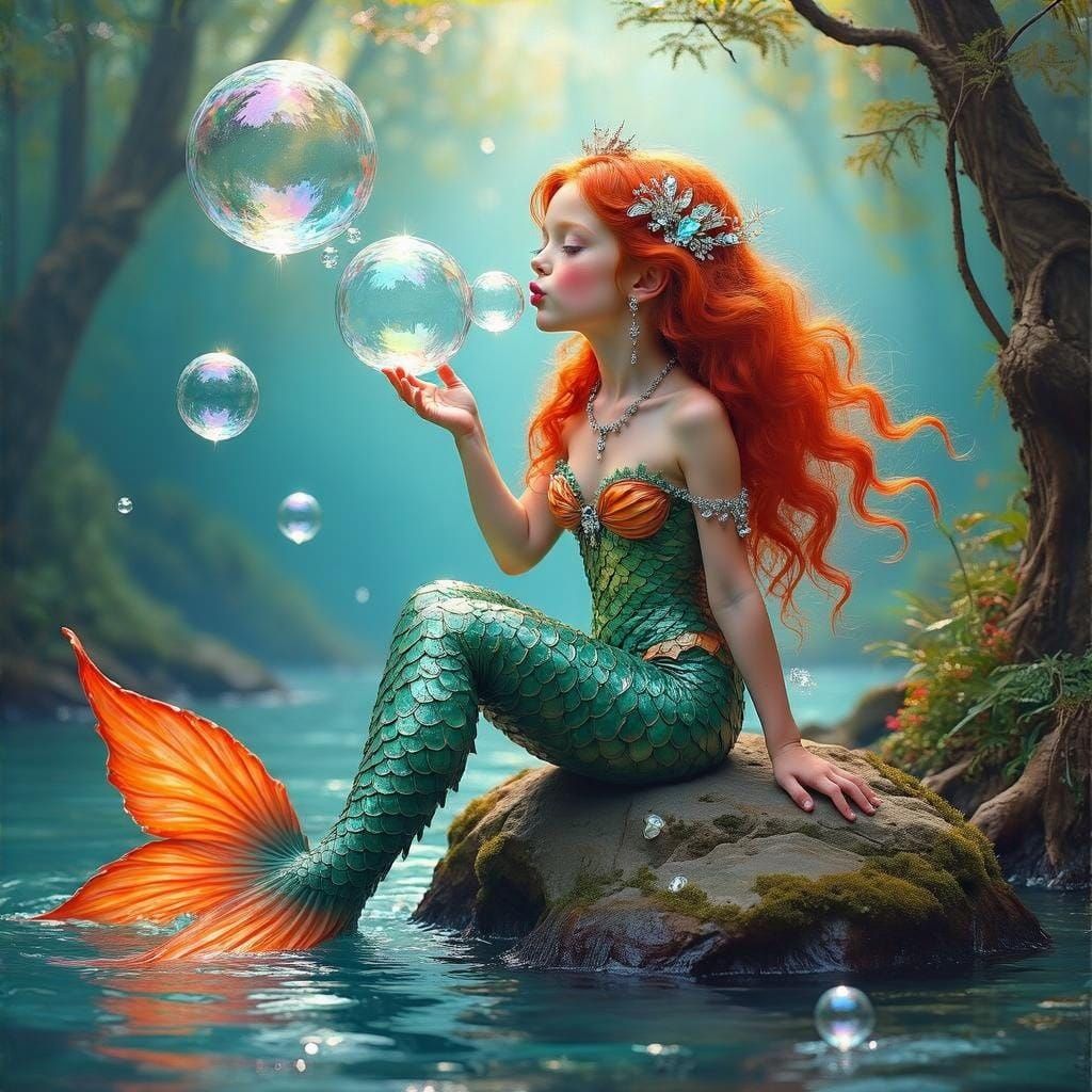 A striking picture of a red-headed mermaid girl blowing bubbles in an ocean forest. This photorealistic Renaissance-style portrait features bright colors and dreamlike aesthetics.