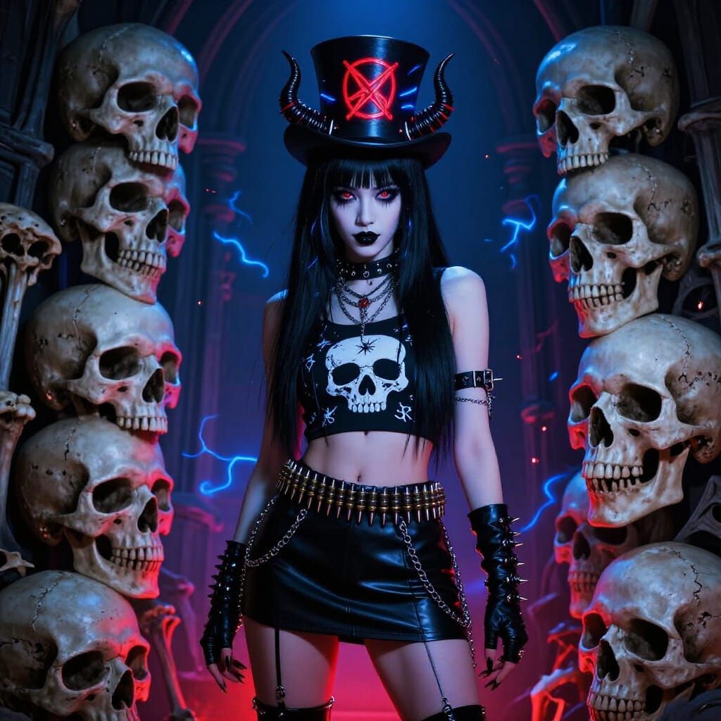 A striking late-1980s deathcore/gothic metal aesthetic digital artwork of a pale demonic young woman with long straight jet-black hair, glowing crimson eyes, black lips, and small black horns adorned with red spikes. She stands between the skulls touching the skulls on either side exuding menace and ...
