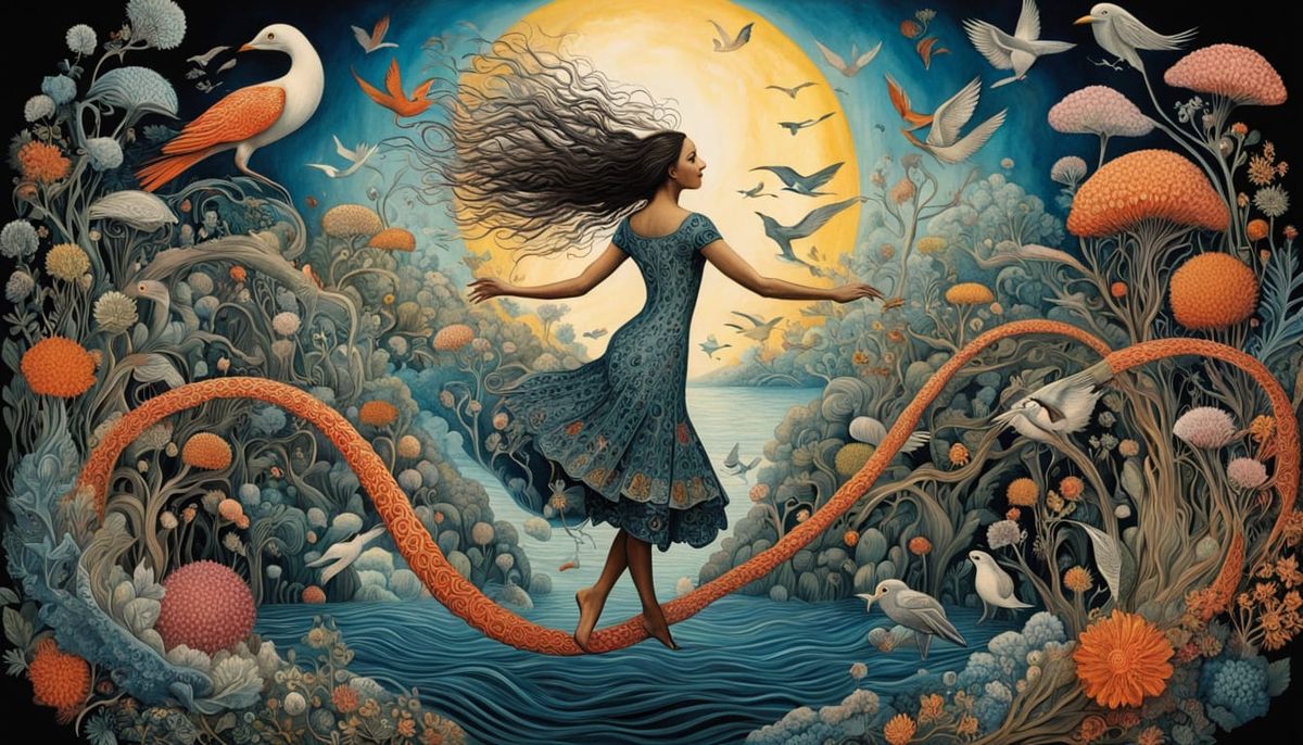 This image shows a woman dancing amidst swirling abstract patterns and bioluminescent details. The dancer, in a psychedelic style, appears to be transforming with colorful ink flowing around her.