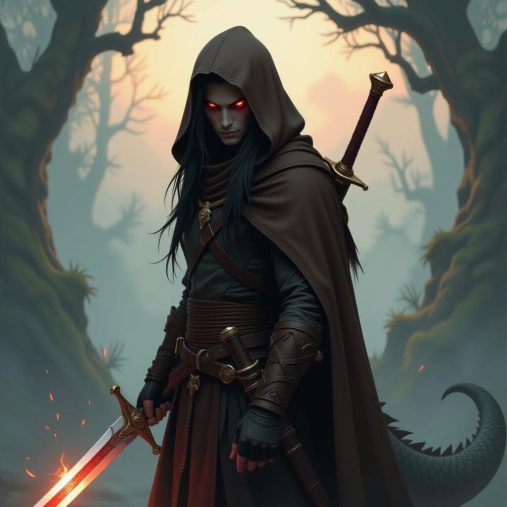 This dark fantasy concept art features a warrior with a dragon tail, red eyes, and a hooded poncho, holding a glowing sword. Set in a misty forest at dusk, the scene uses dramatic lighting and earthy tones.