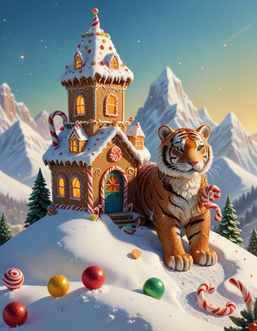 A whimsical illustration of a gingerbread tiger protecting a candy cane fortress atop a snowy mountain. This confectionery artwork evokes a vintage Christmas card with sugary textures.