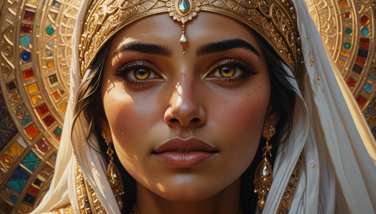 A close-up image of an Arab woman wearing a white and gold headdress, looking up. The image features golden light on her face and intricately detailed eyes with vibrant colors, in an oil painting style.