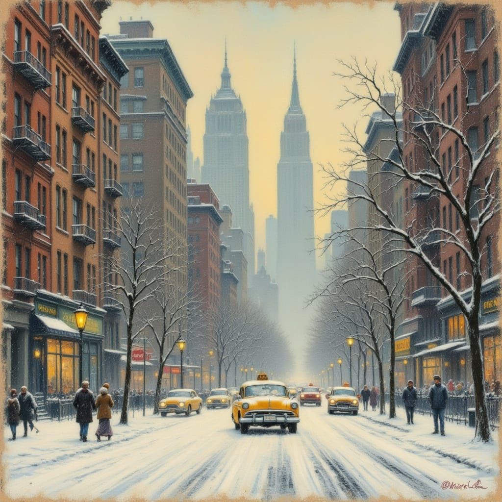 This image captures a snowy New York City winter scene in a vintage travel poster style. A classic yellow taxi drives on a snow-covered street with pedestrians and the Empire State Building in the background.