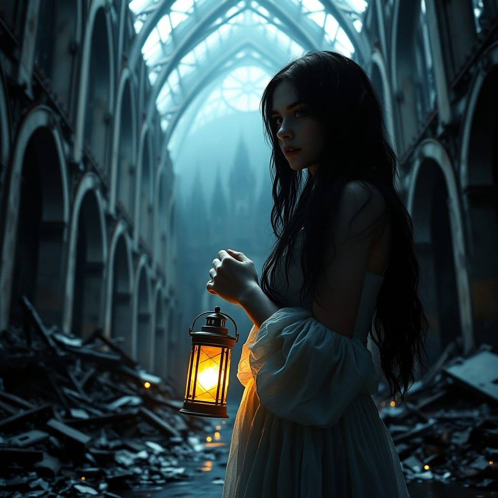 A haunting portrait of a woman in a ravaged cathedral, surrounded by rubble and decay, with a lantern casting a warm glow on her face, evoking a sense of melancholy and unease.