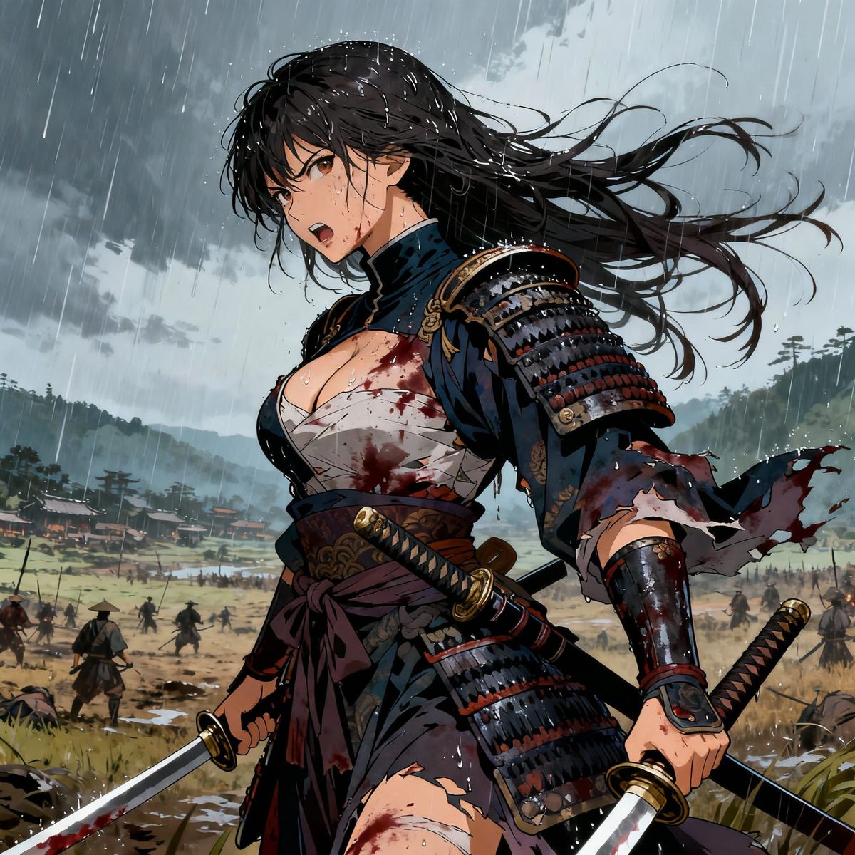 This image captures a detailed, wide-angle view of a bleeding samurai woman on a wet, feudal battlefield. The anime-inspired artwork features cinematic lighting and cel-shaded effects.