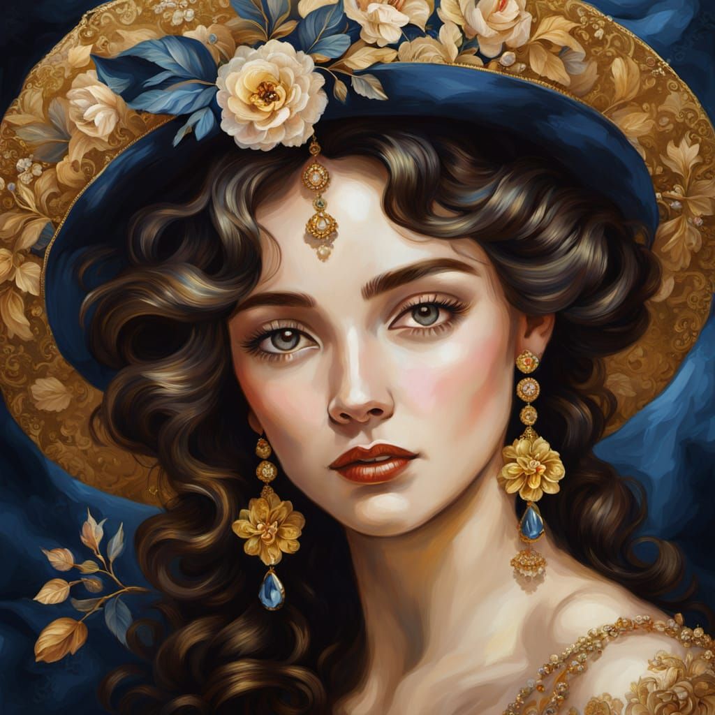 An oil painting portrait of a woman with dark curly hair adorned with flowers and a golden hat. Features delicate brushstrokes, intricate patterns, and rich golden lighting with deep blue shadows.
