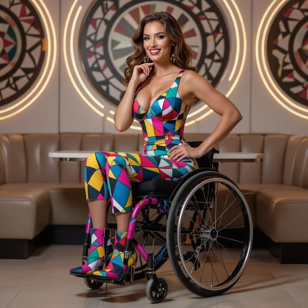 This image shows a confident, athletic woman in a playful pinup pose in a vibrant wheelchair. She wears a designer outfit with bold geometric patterns and high-heeled boots.
