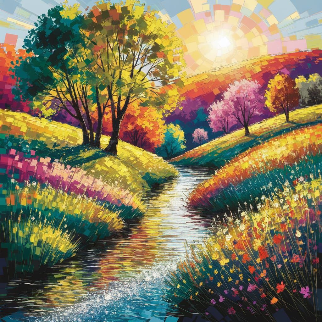This image shows a vivid landscape painting with sunlight dappling through trees. A clear brook winds through rolling hills dotted with wildflowers, all rendered with crystal-clear detail in an oil painting style.