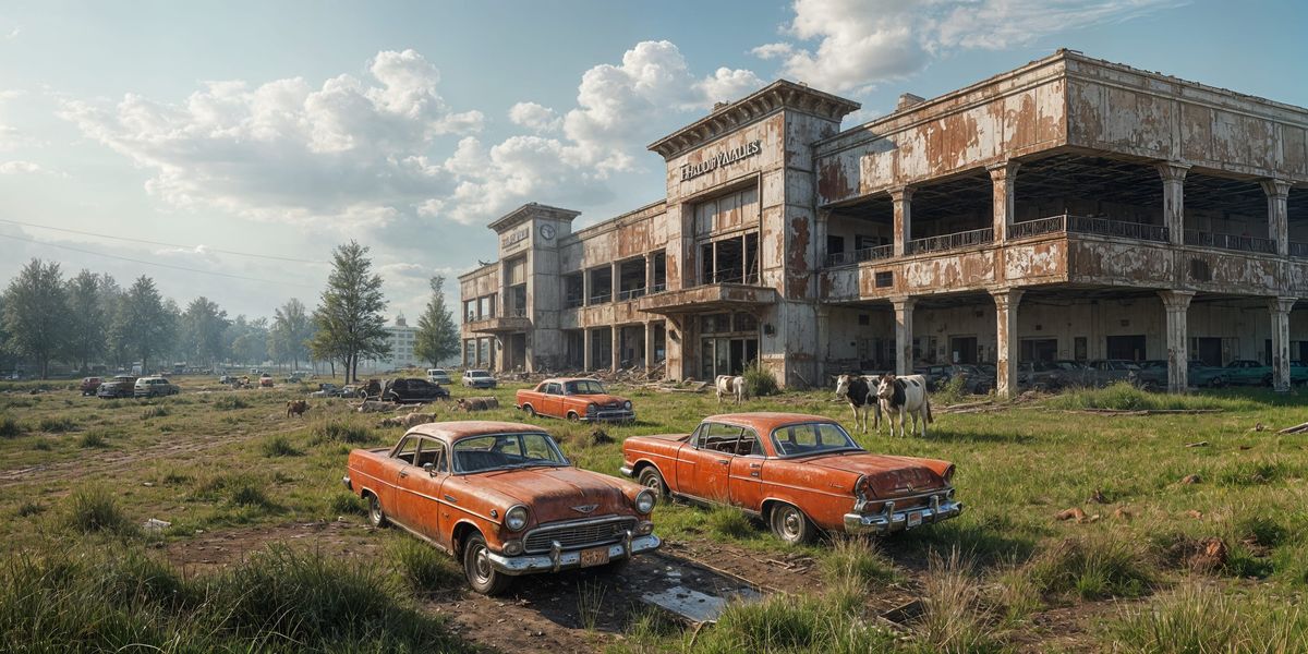 This image shows an abandoned mall where decaying cows graze among rusted, crushed cars. The scene evokes a surreal, post-apocalyptic atmosphere with retro-futuristic and dystopian elements.
