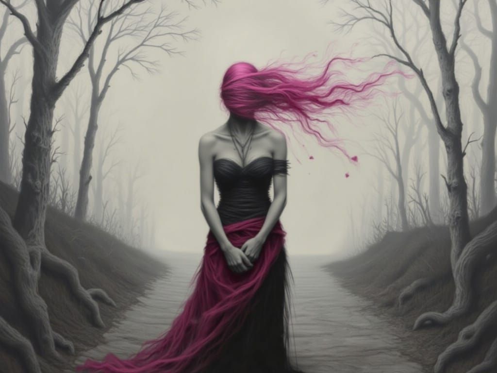 This image depicts a woman with pink hair, blindfolded and bound, in a desolate setting. The expressionist style uses vivid colors and dramatic lighting to convey isolation and distress.