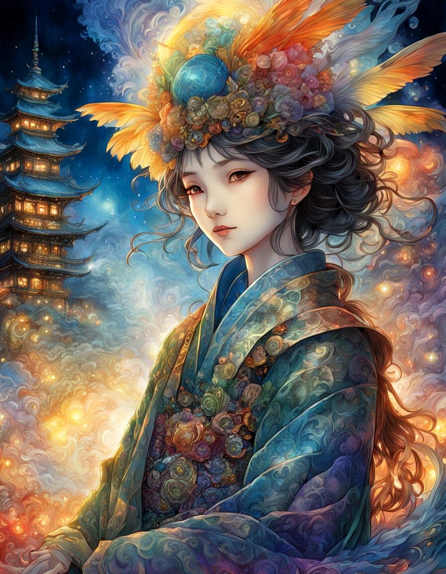 This image features a winged fantasy character with a gentle smile, adorned in a patched robe and feathered hat. It's set against an ancient, magical city backdrop, rendered in a vivid anime painting style with intricate watercolor and ink details.