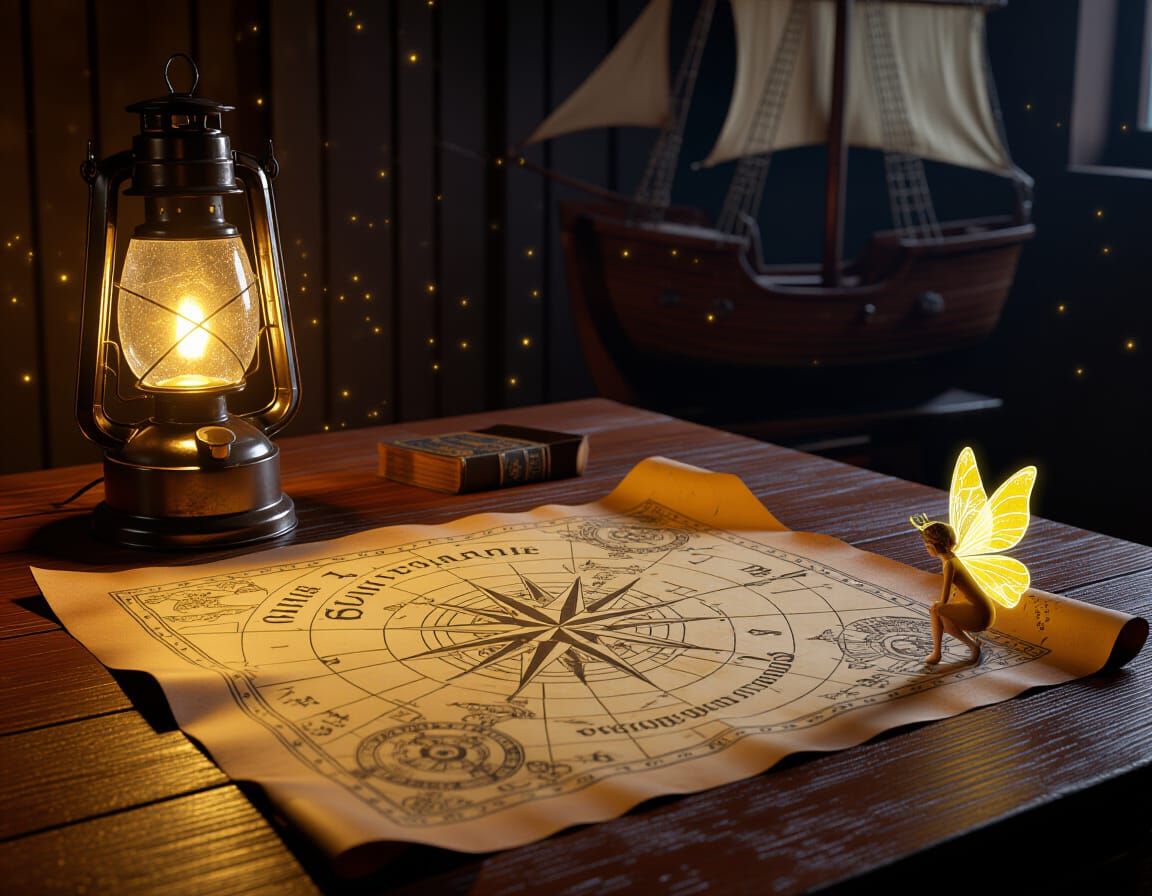 A vintage pirate treasure map is illuminated by an oil lamp on a wooden table. A shimmering light effect and a whimsical fairy enhance the fantastic, antique aesthetic.