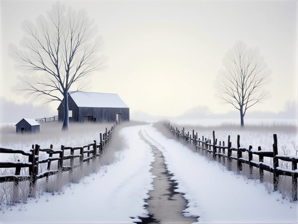 This image depicts a serene winter landscape featuring a snow-covered country road and a rustic barn. The scene is rendered in a realistic, artistic style with diffused winter light creating an ethereal glow.