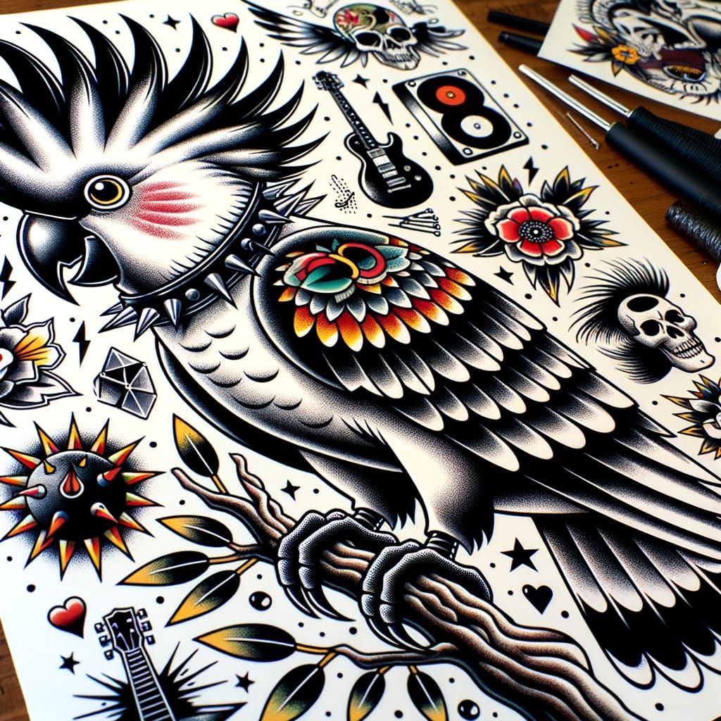 This image showcases a flash tattoo sheet featuring a punk rock cockatoo in a traditional tattoo style. The design incorporates punk elements like a spiked collar and mohawk, set against smaller punk accessories.