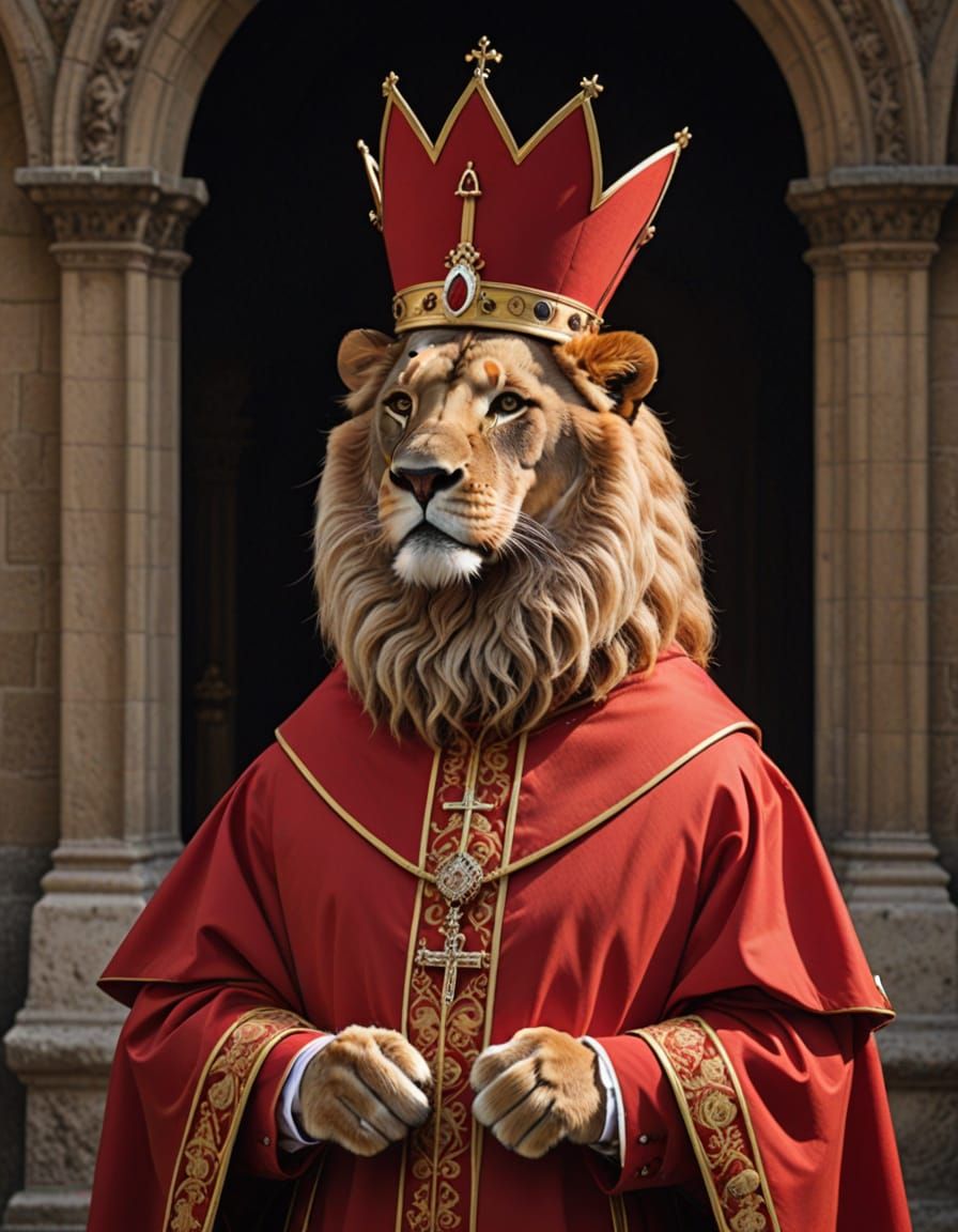 This image shows a majestic lion dressed as a cardinal, blending regal and spiritual elements in a unique artistic vision