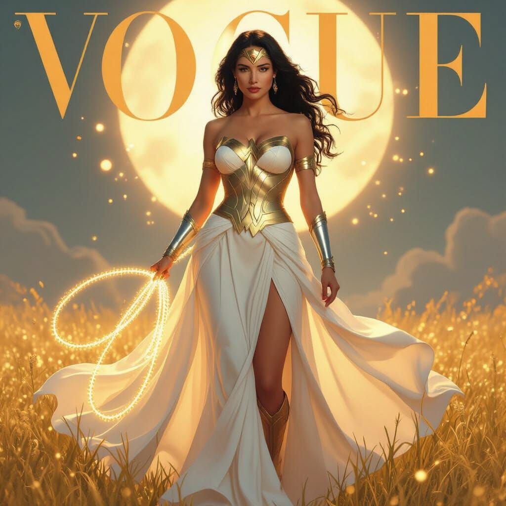 This image depicts Wonder Woman as a goddess on a Vogue cover, bathed in golden light and wearing a flowing white gown. It features ethereal lighting and a touch of magical realism, inspired by art nouveau and comic art styles.