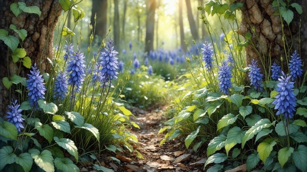 A delicate Scilla bifolia blooms in the early spring, surrounded by lush foliage and vibrant colors, reminiscent of Impressionist and Art Nouveau styles, with intricate details and a dreamlike quality