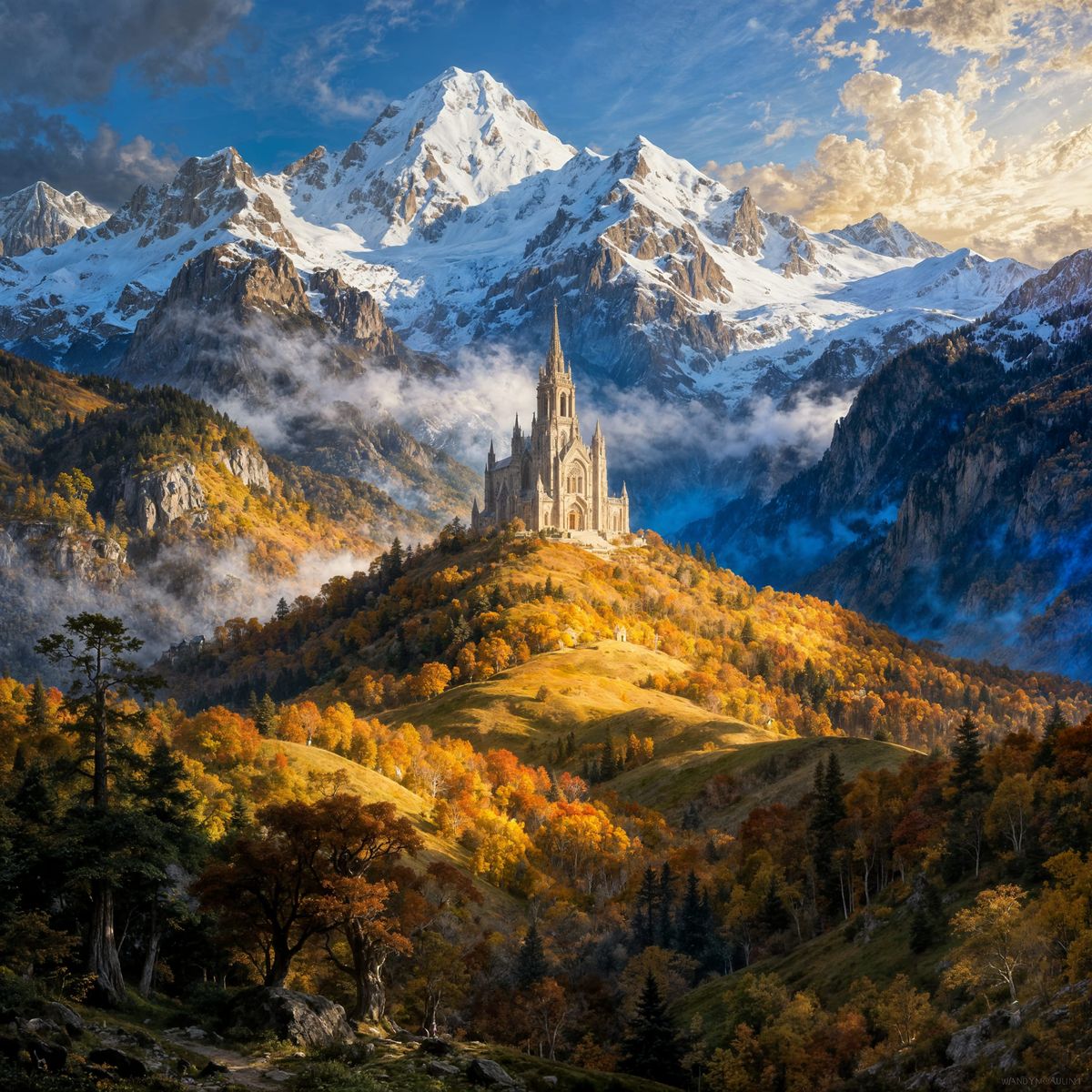 This image depicts a magnificent classical painting of a fantasy realm. It features rolling hills, autumn forests, distant snowcapped mountains, and a central hilltop cathedral, all rendered in brilliant colors.