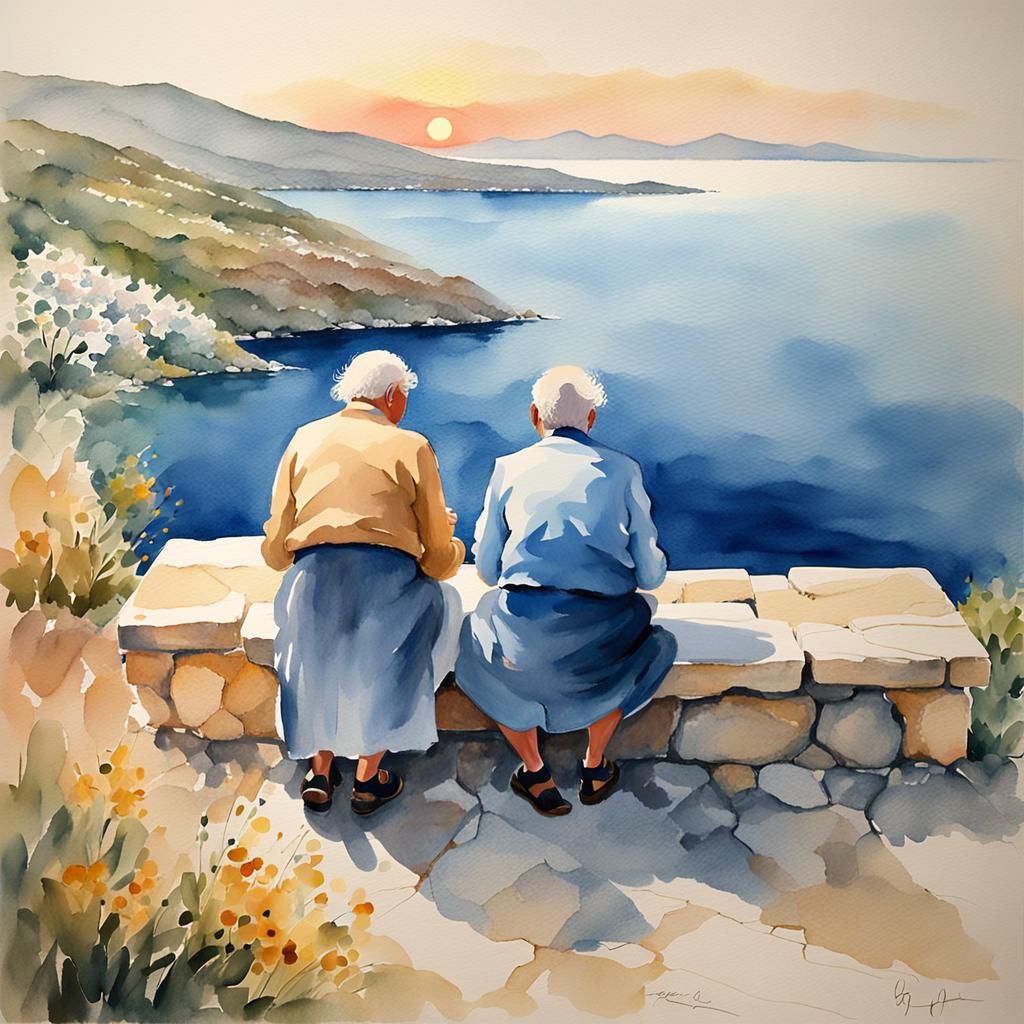 This image shows an elderly couple sitting on a stone bench, gazing out at the Aegean Sea in Greece. The scene is rendered in a soft watercolor impressionist style, with a warm, muted color palette and a dreamy, peaceful atmosphere.