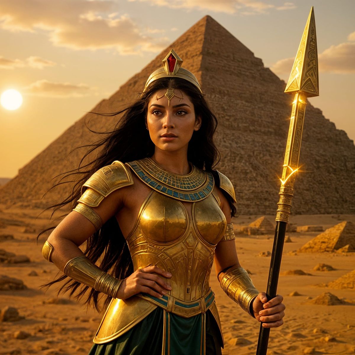 This image showcases an elegant Egyptian beauty with dark hair, adorned in radiant golden retrofuturistic armor, holding a glowing spear before a sci-fi pyramid. Realistic, cinematic style.