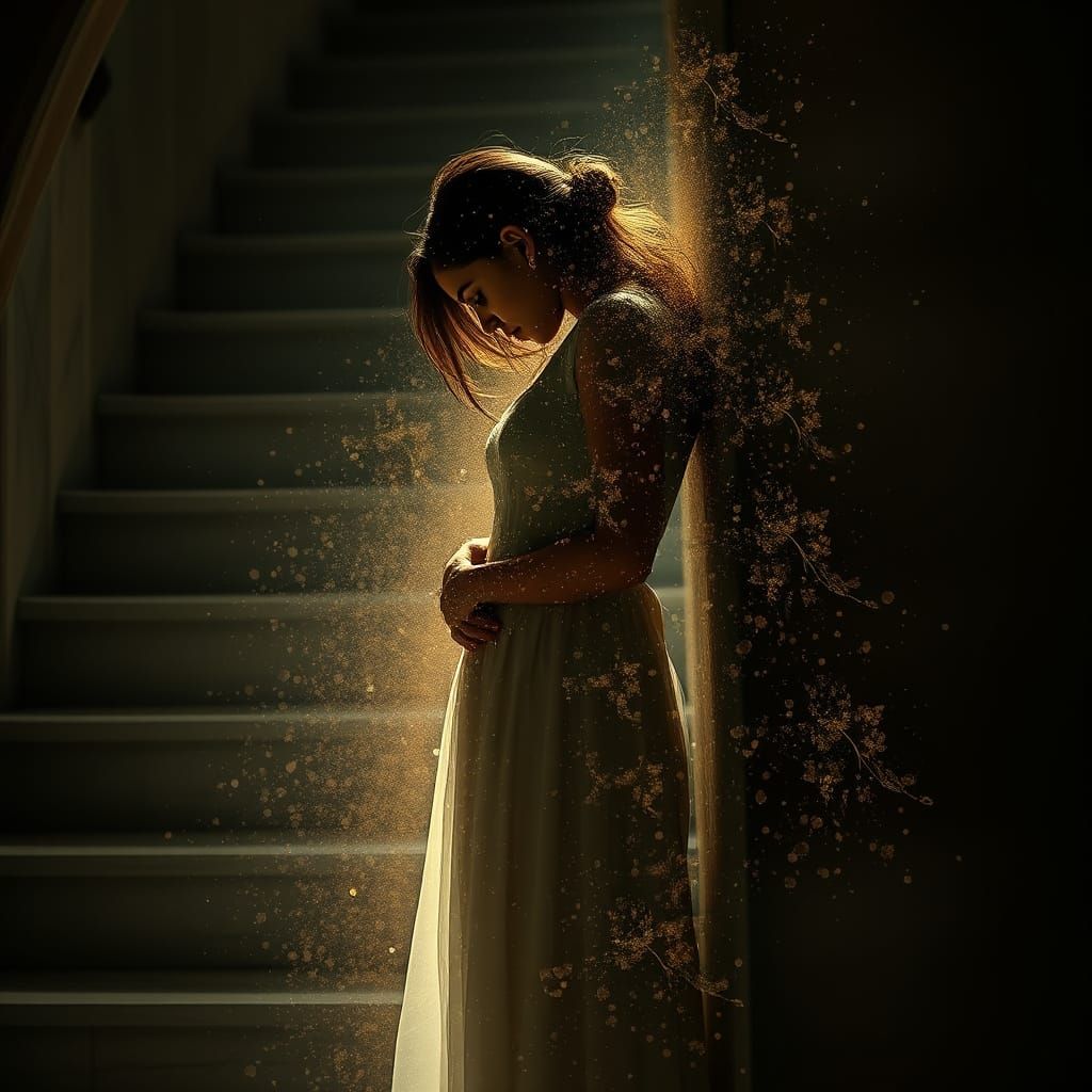 This image shows a woman lost in a dreamlike world of crumbling glass and misty leaves, bathed in soft, Vermeer-inspired lighting.