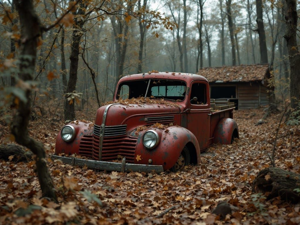 A haunting image shows an abandoned pickup truck decaying in a dense, overgrown forest. The scene blends textural realism with atmospheric clarity in a timeworn Americana setting.