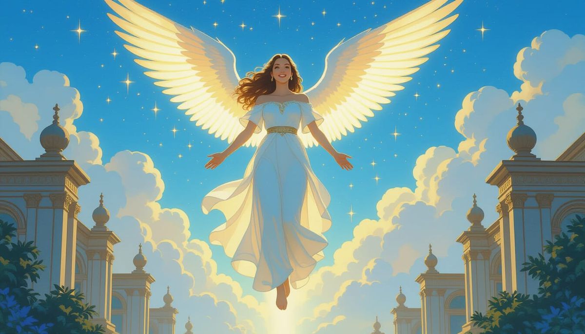 This image shows a beautiful, smiling goddess with glowing wings descending from the sky. Below her, the Earth is transforming into a celestial temple, rendered as an oil painting.