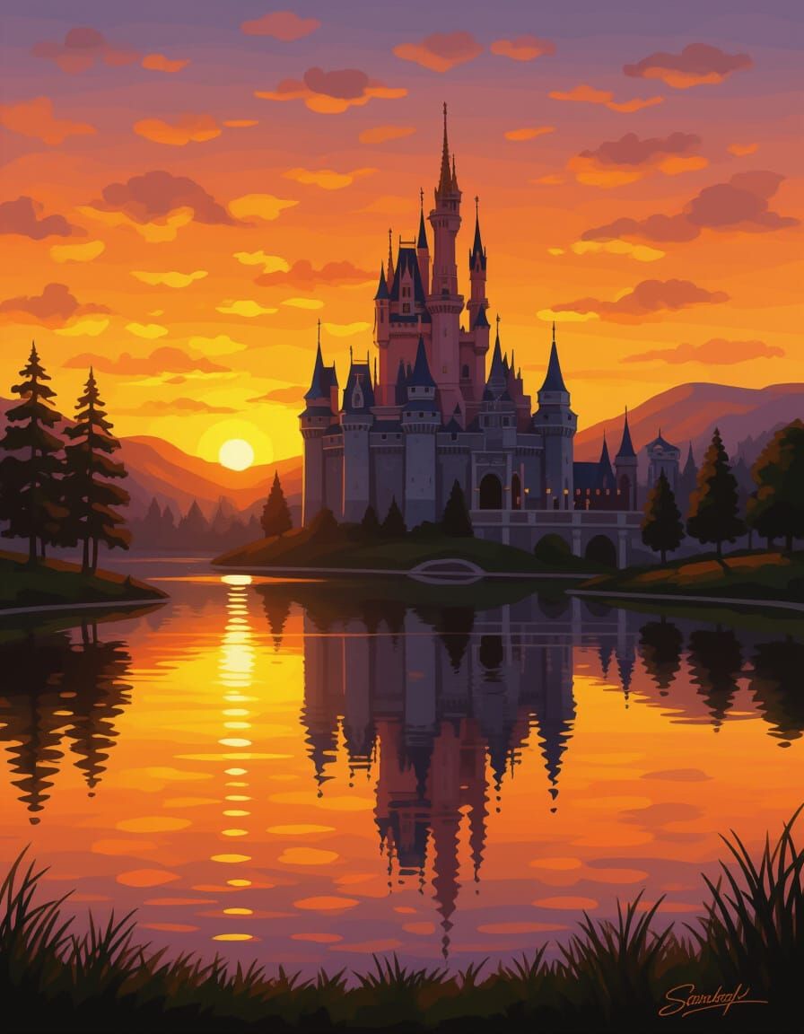 This image shows a fairytale castle on a hill by a lake reflecting a fiery sunset. The scene features swaying trees and glowing impasto highlights in a tranquil, expansive style.