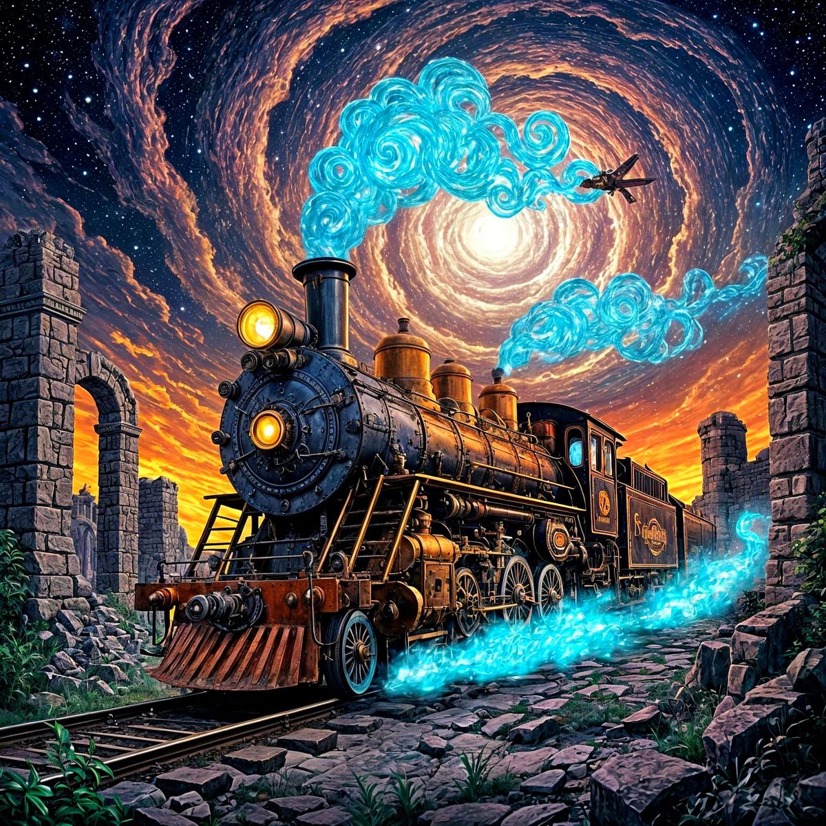 A vintage steam locomotive, reimagined with retro-futuristic embellishments, chugs through a fantastical landscape dotted with ancient ruins. The sky above is a swirling vortex of nebulae and stardust. The scene is rendered in a bold, comic book art style with vivid colors and dynamic linework, evoking ...