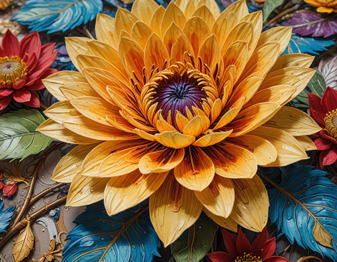 A striking close-up of bold floral patterns in a vibrant oil painting style. Expressive brushstrokes and warm golden lighting enhance the abstract expressionism surrealism aesthetic.