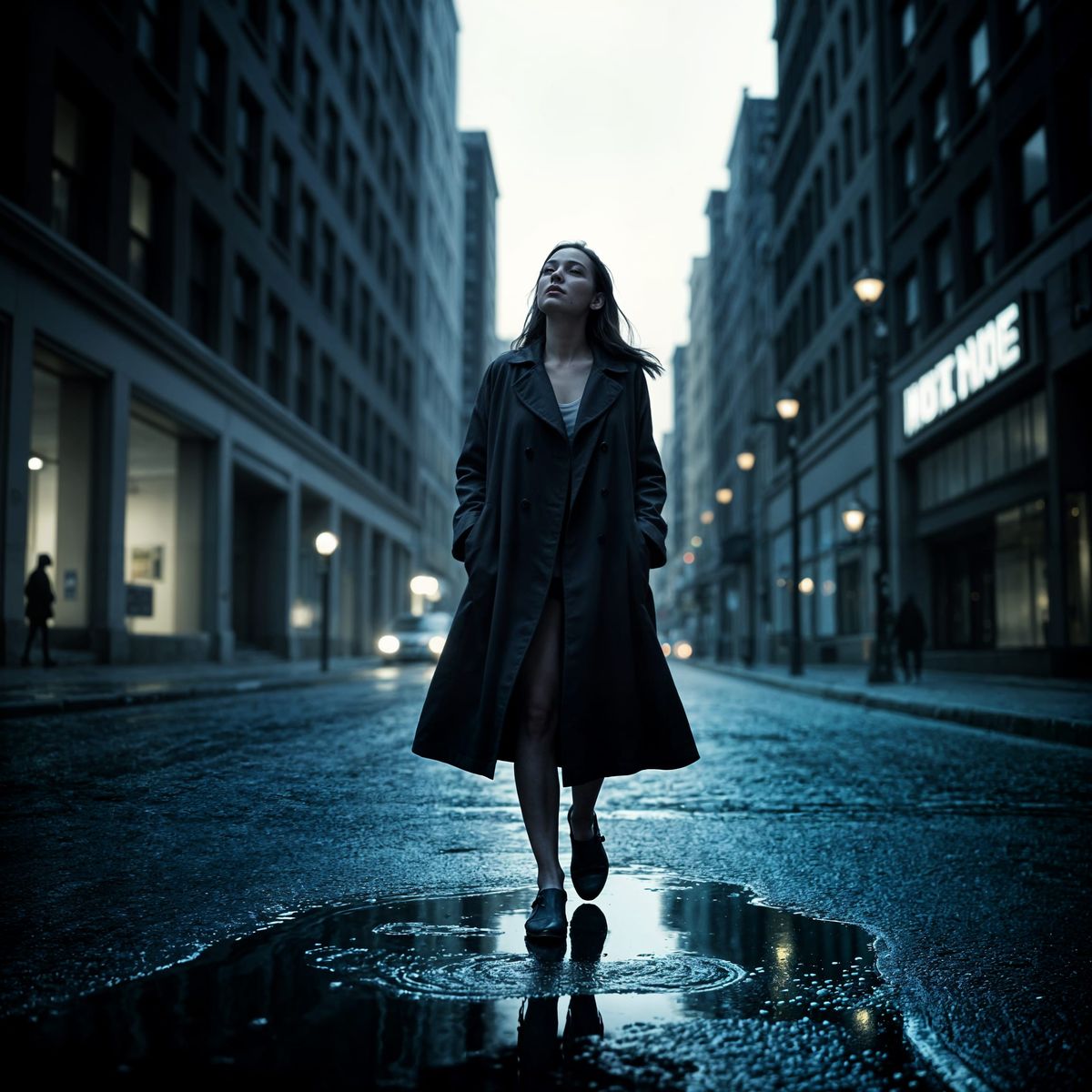 This photorealistic image captures a lone woman in a flowing coat walking down a rain-slicked city street at dusk. Moody, cinematic lighting and a monochrome palette with blue and gray tones create a dreamlike, alienated atmosphere.