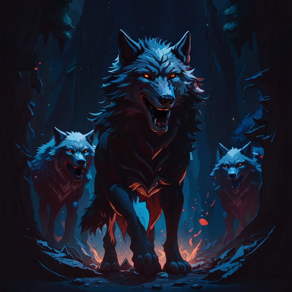 This image shows a pack of wolves in a dark fantasy setting, rendered in detailed 8k resolution. The artwork features dynamic and volumetric lighting in purple and yellow complementary colors. The piece has an Art Nouveau aesthetic.