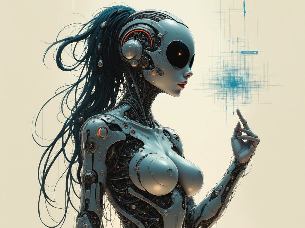 This concept art showcases a beautiful cyborg with sleek metallic enhancements and expressive eyes, surrounded by holographic data. The image features dynamic lighting and a desaturated palette, evoking forgotten technology.